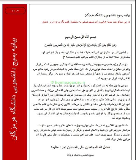 بیانیه بسیج دانشجویی دانشگاه هرمزگان در پی محکومیت حمله هوایی رژیم صهیونیستی به ساختمان کنسولگری ایران در دمشق