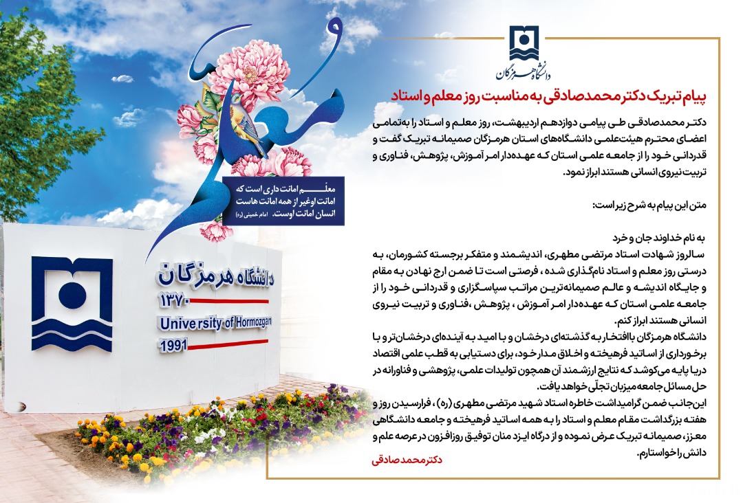 پیام تبریک جناب آقای دکتر محمد صادقی به مناسبت روز استاد و معلم
