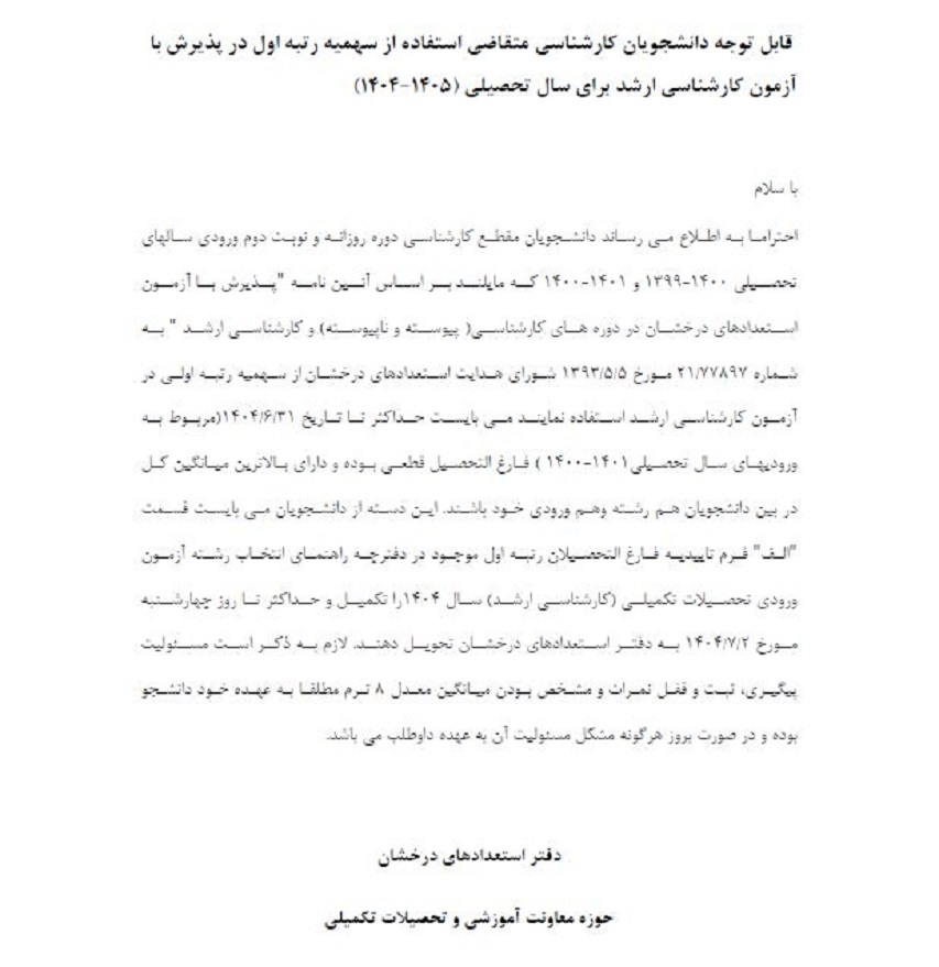 تمدید اطلاعیه استفاده از سهمیه رتبه یک در کنکور کارشناسی ارشد ویژه دانشجویان مقطع کارشناسی ورودی مهرماه سال های تحصیلی 1399/1400 و 1400/1401