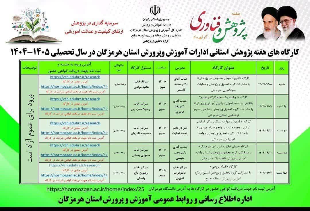 به مناسبت هفته پژوهش و فناوری سال 1404، با همکاری گروه آموزش های آزاد و مجازی دانشگاه هرمزگان با اداره کل آموزش و پرورش استان هرمزگان، کارگاه های آموزشی و دانش افزایی ویژه فرهنگیان و معلمان محترم از تارخ 8 آذرماه لغایت 12 آذرماه سال جاری به شکل مجازی برگزار خواهد شد. در این راستا ضمن ثبت نام این عزیزان بعنوان گروه کاربری فرهنگیان و معلمان در زیر سایت آموزش های آزاد و مجازی به آدرس https://vchu.hormozgan.ac.ir/account/sabt1، نیاز هست با یوزر و پسورد تعریف شده بعنوان کاربر فرهنگیان و معلمان وارد سامانه شوند (دکمه ورود به سامانه) و درس ها و دوره های تعریف شده ویژه فرهنگیان را انتخاب نمایند.