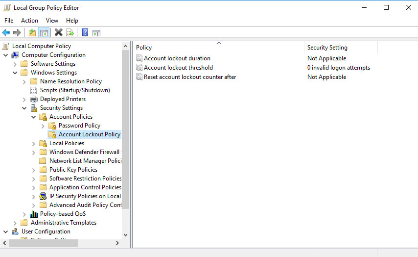 – ACCOUNT LOCKOUT DURATION = 2 MIN – ACCOUNT LOCKOUT THRESHOLD = 1 – RESET ACCOUNT LOCKOUT COUNTER AFTER = 2 MIN