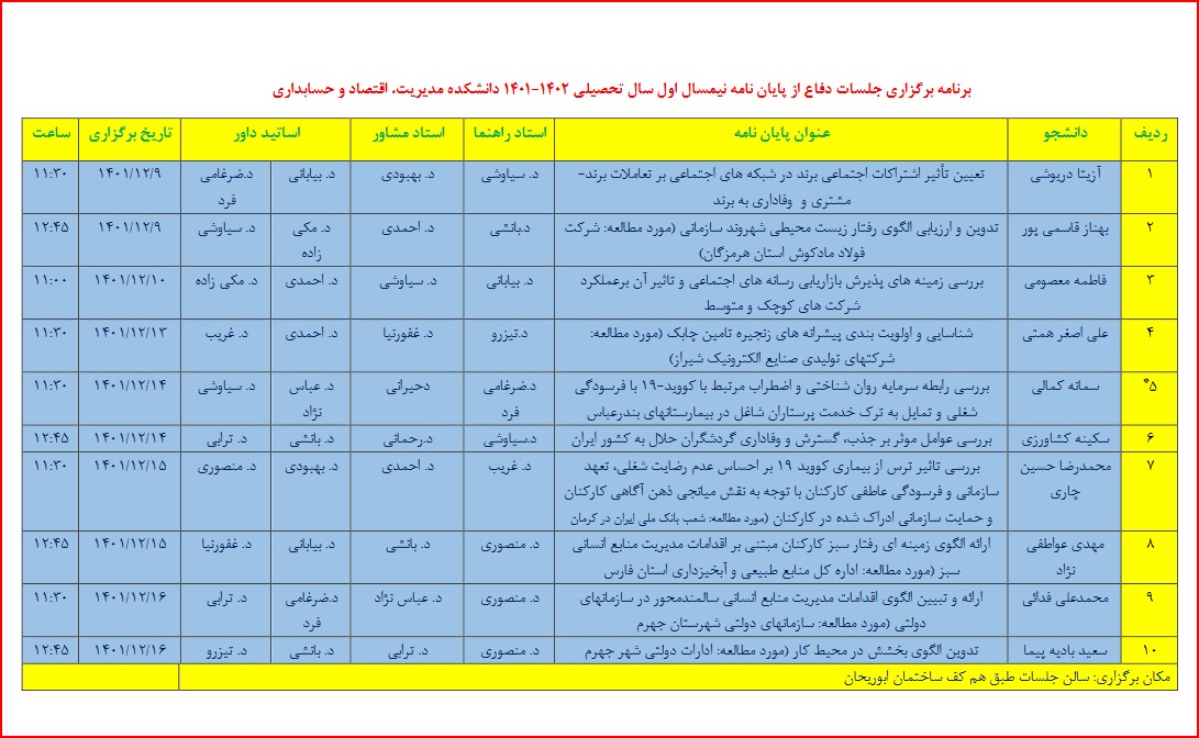 برنامه دفاع دانشجویان ارشد دانشکده مدیریت اقتصاد و حسابداری