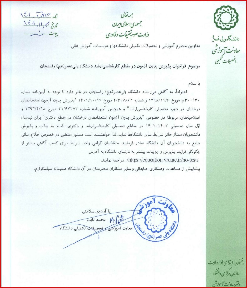 فراخوان استعداد های درخشان دانشگاه ولی عصر رفسنجان