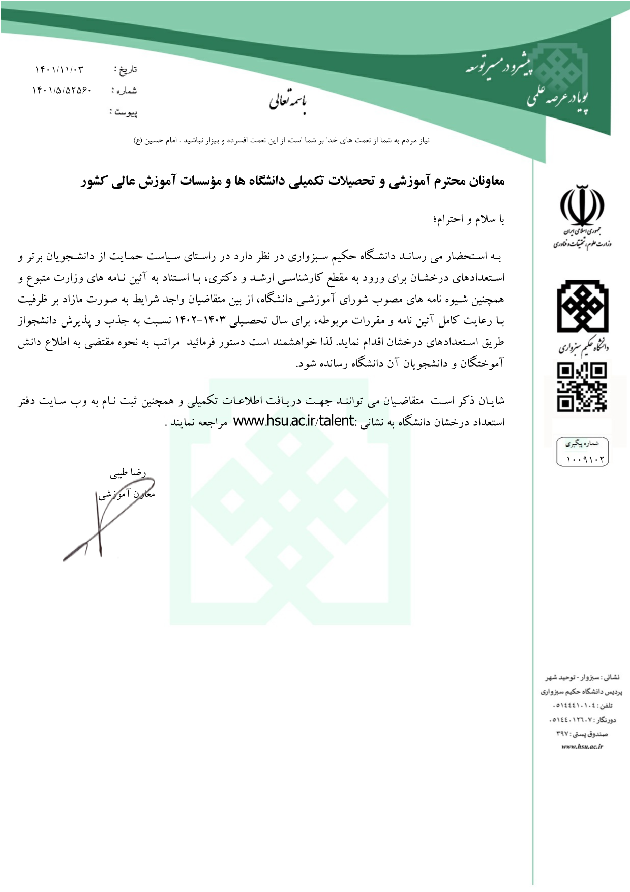 فراخوان جذب استعداد های درخشان دانشگاه حکیم سبزواری