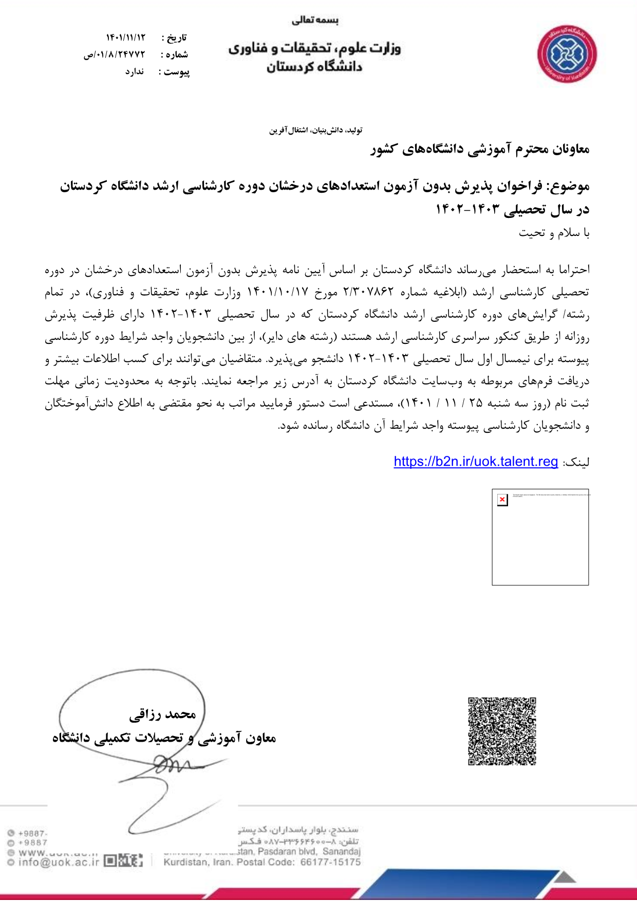 فراخوان استعداد های درخشان دانشگاه کردستان
