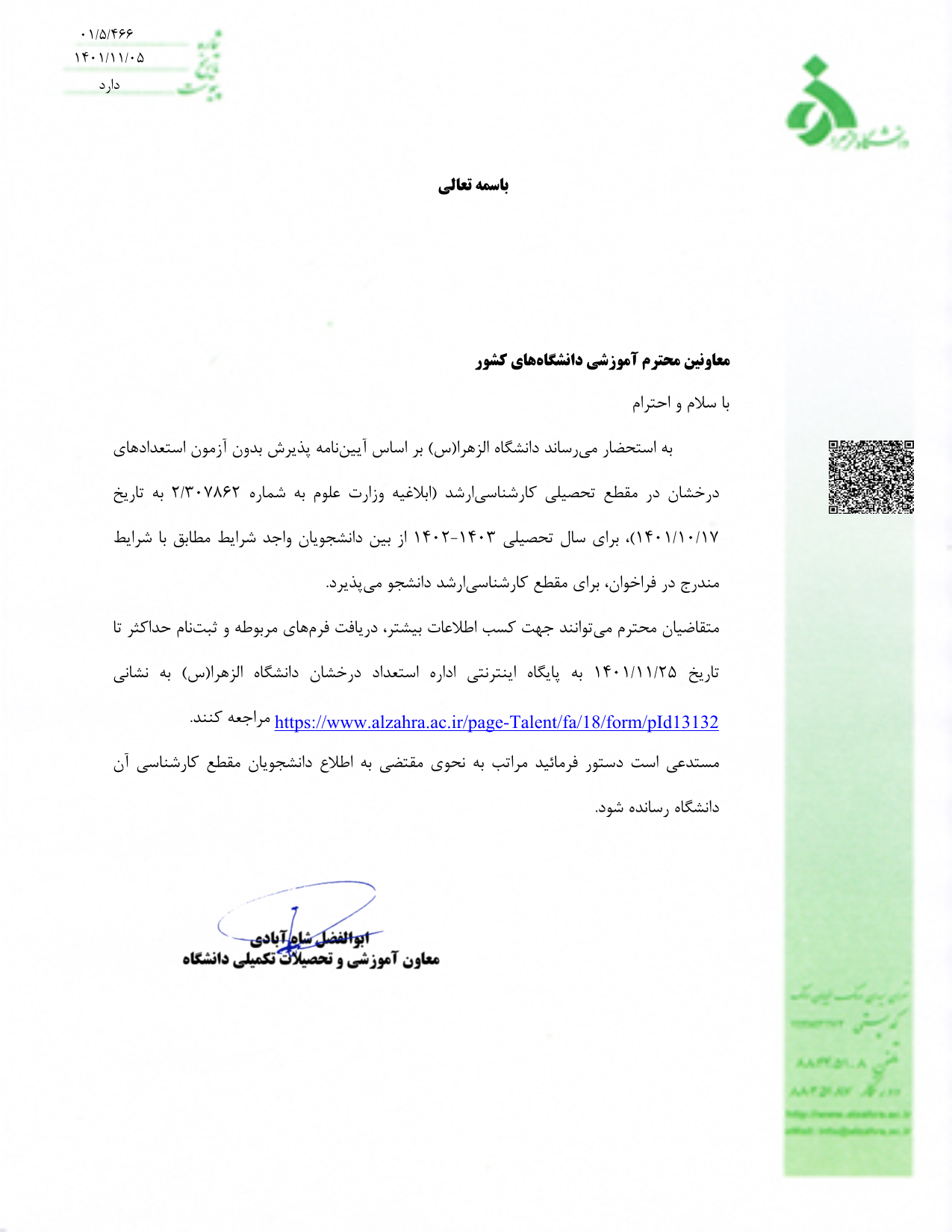 فراخوان جذب استعداد های درخشان دانشگاه الزهرا