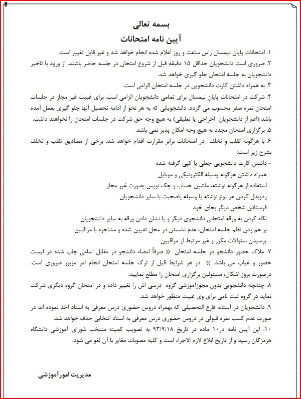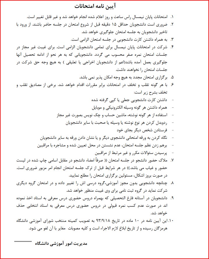 آیین نامه آموزشی برگزاری امتحانات پایان نیمسال