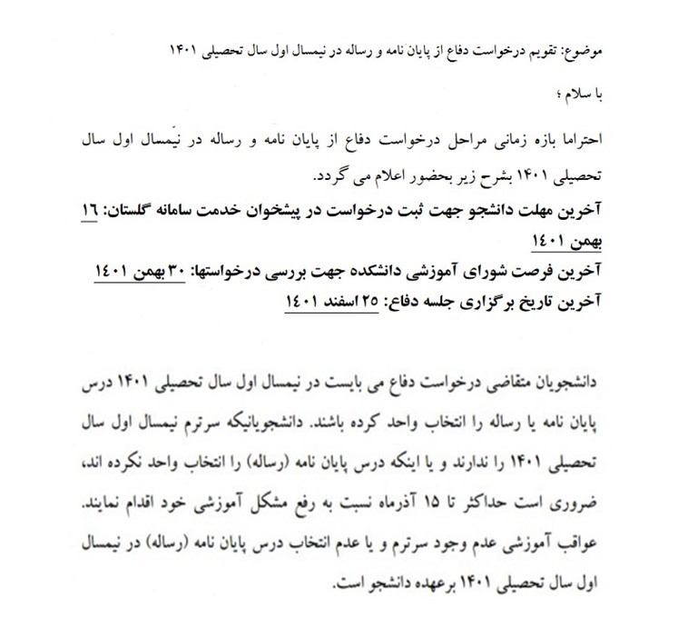 تقویم درخواست دفاع از پایان نامه و رساله دکتری در نیمسال اول 1401