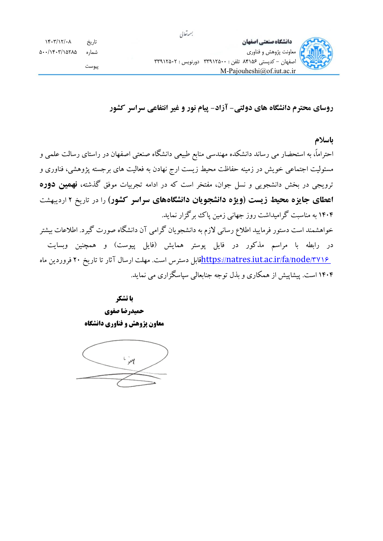 نهمین دوره اعطای جایزه مجیط زیست ویژه دانشجویان سراسر کشور