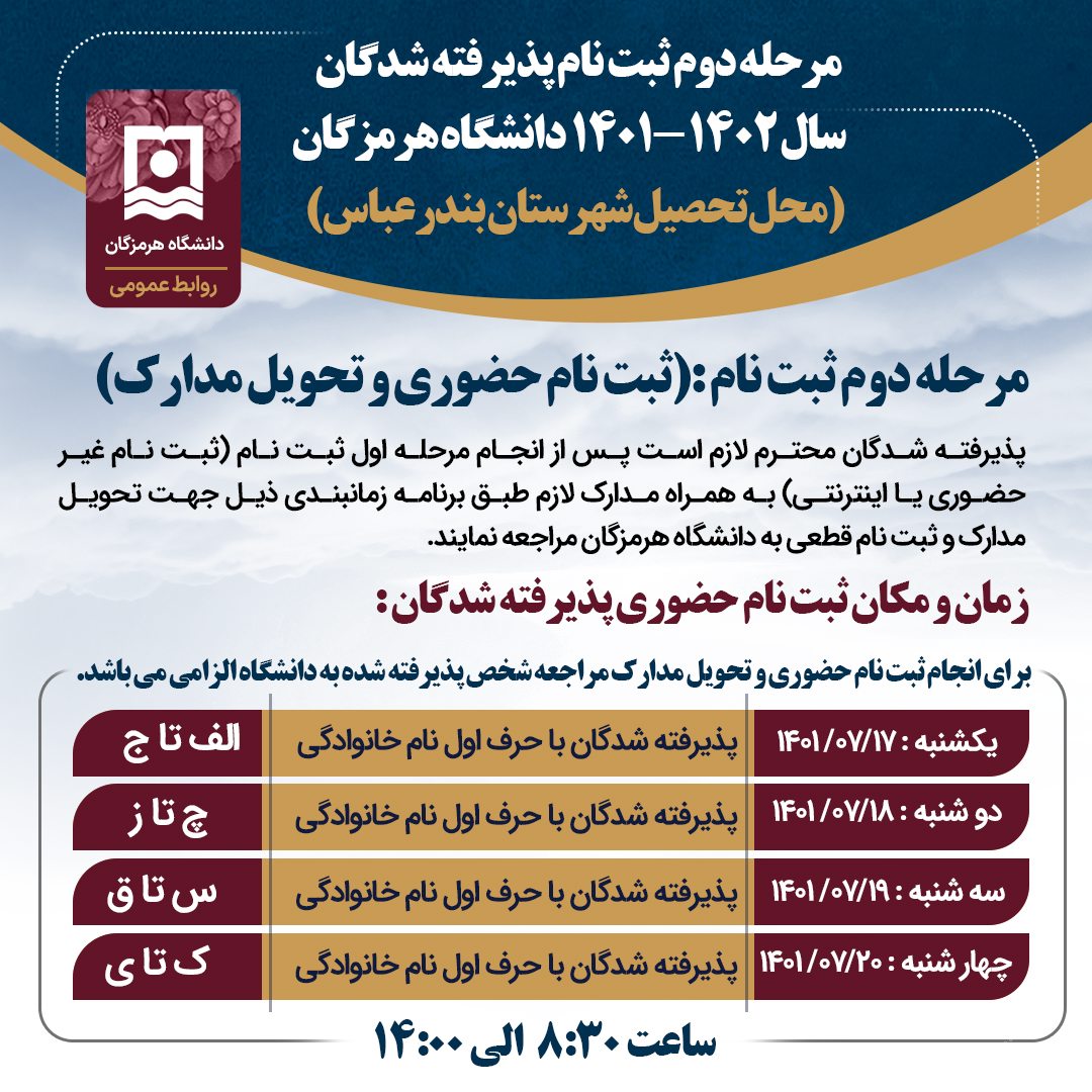 مرحله دوم ثبت نام پذیرفته شدگان سال 1402-1401 دانشگاه هرمزگان