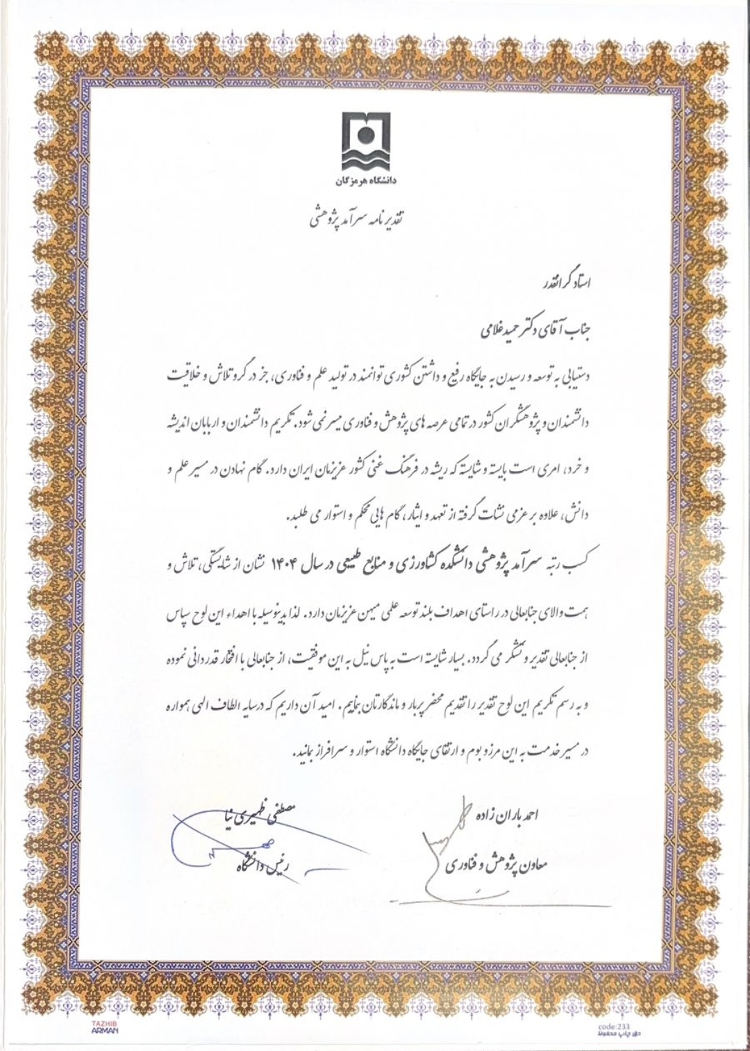 تقدیر از جناب آقای دکتر حمید غلامی در هفته پژوهش برای کسب رتبه سرآمد پژوهشی دانشکده کشاورزی و منابع طبیعی در سال 1404