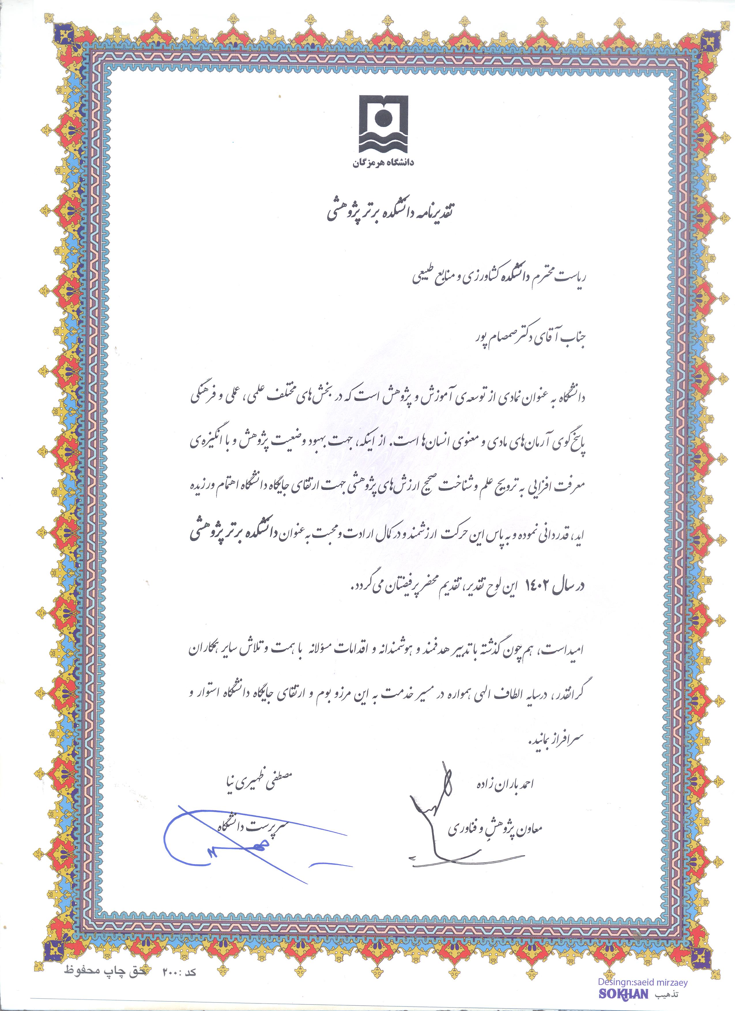 تقدیر از دانشکده کشاورزی و منابع طبیعی به عنوان دانشکده پژوهشی برتر